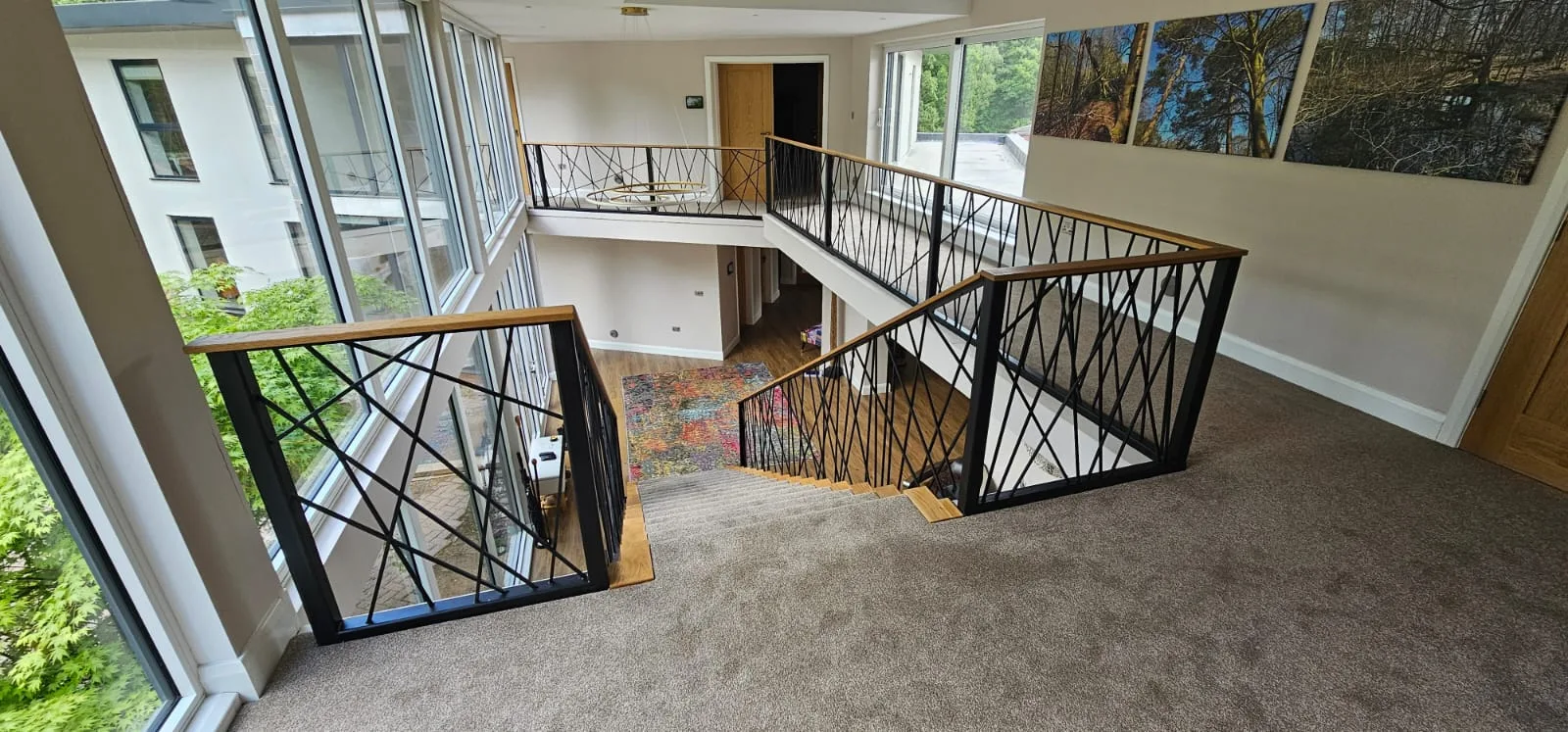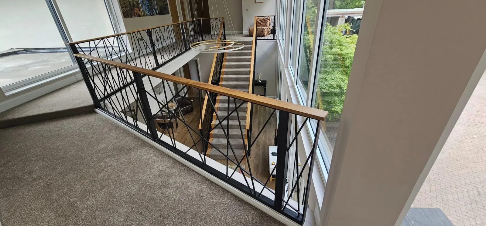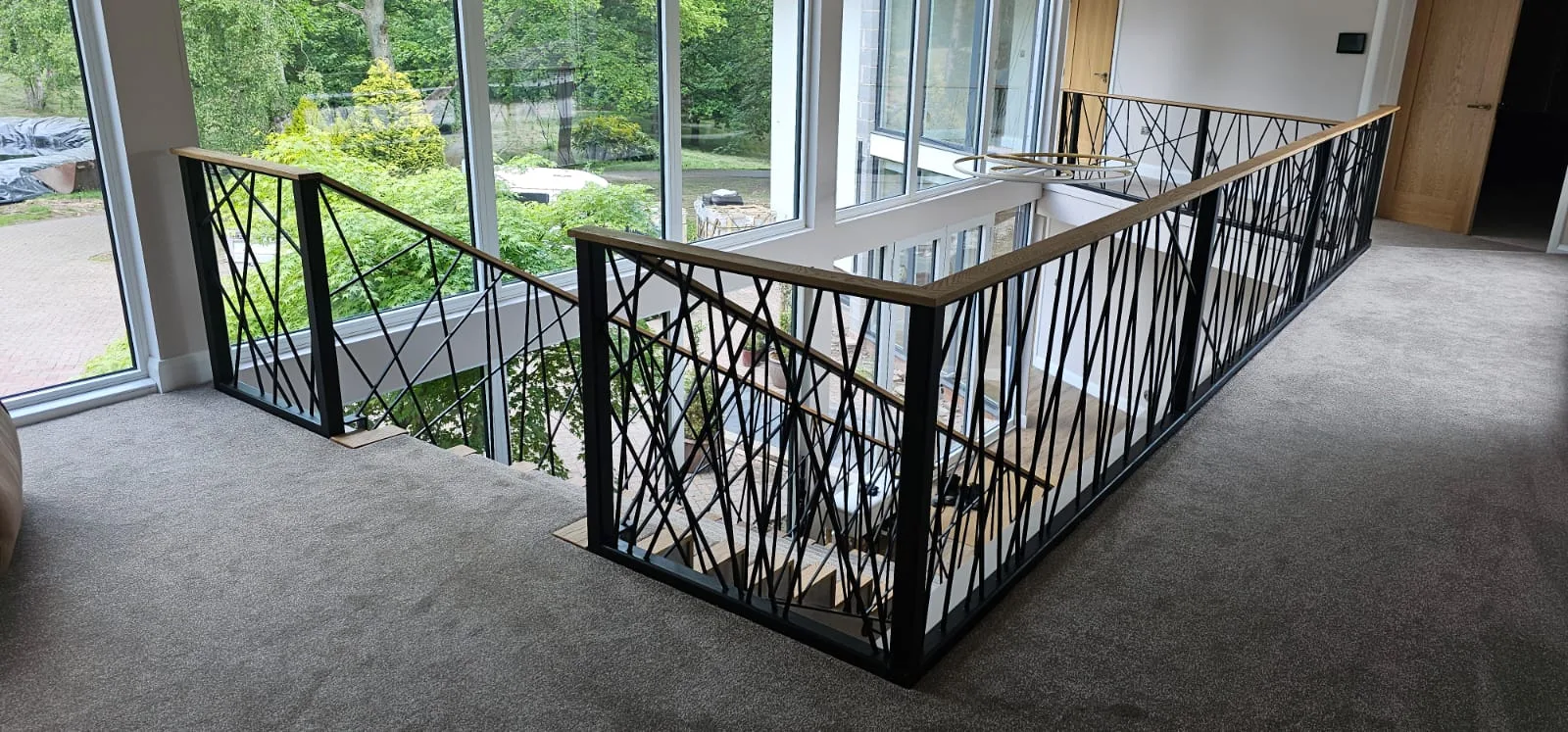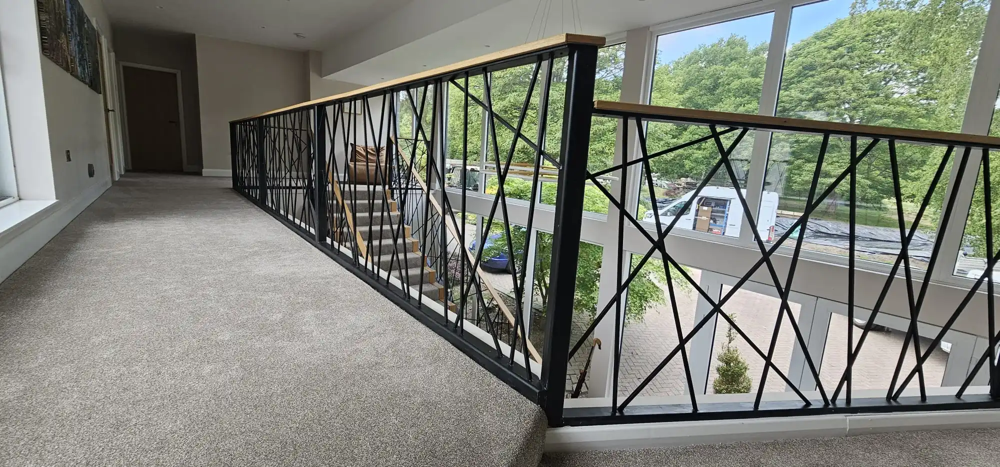 The brief was to create a safe, compliant barrier while delivering a more architectural, design-led finish in keeping with the open-plan space and large glazed elevations. A custom infill pattern was developed using intersecting steel bars, creating a unique visual feature while maintaining strength and functionality.